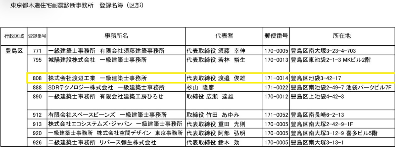 東京都内には昭和56年以前のいわゆる旧耐震基準で建てられている建物が多くあり、現在の耐震基準では地震時の耐力が不足している場合があり倒壊など人命に関わる被害を受ける可能性が考えられます。中には補強等の措置を必要とするものもあり速やかな耐震化が喫緊の課題となっています。 また、耐震化に当たっては、適切な耐震診断を実施し、耐震性能を正しく評価することが必要です。そのため、耐震診断や補強設計は、専門的な知識と経験のある技術者が携わり耐震化を進めていく事が重要です。公益社団法人 東京都防災・建築まちづくりセンターでは木造住宅に特化した耐震診断、補強設計及び工事監理について、都民が安心して木造住宅の耐震化に取り組めるように信頼できる耐震診断事務所の情報を提供しています。当社も東京都木造住宅耐震診断事務所登録をしております。