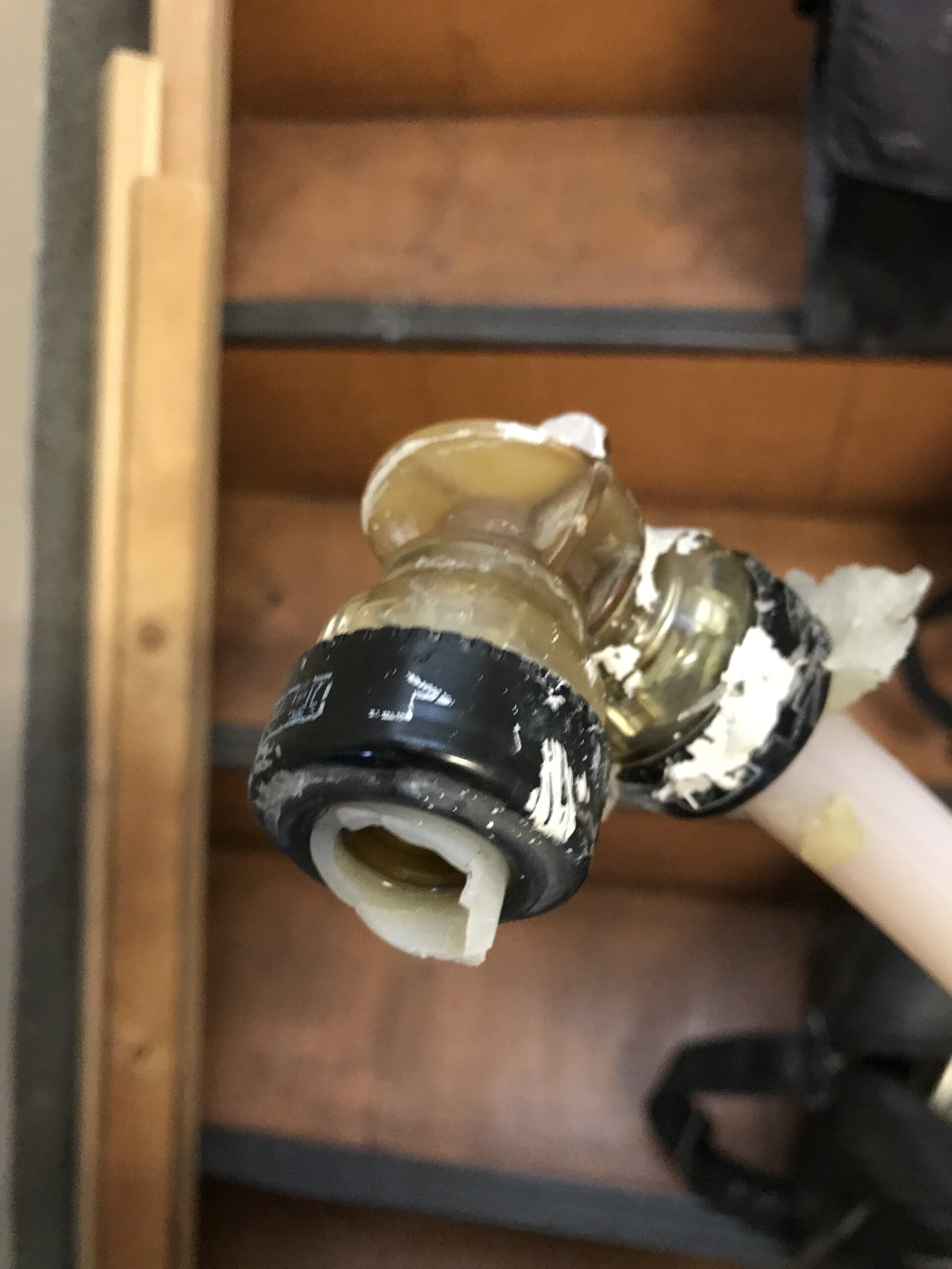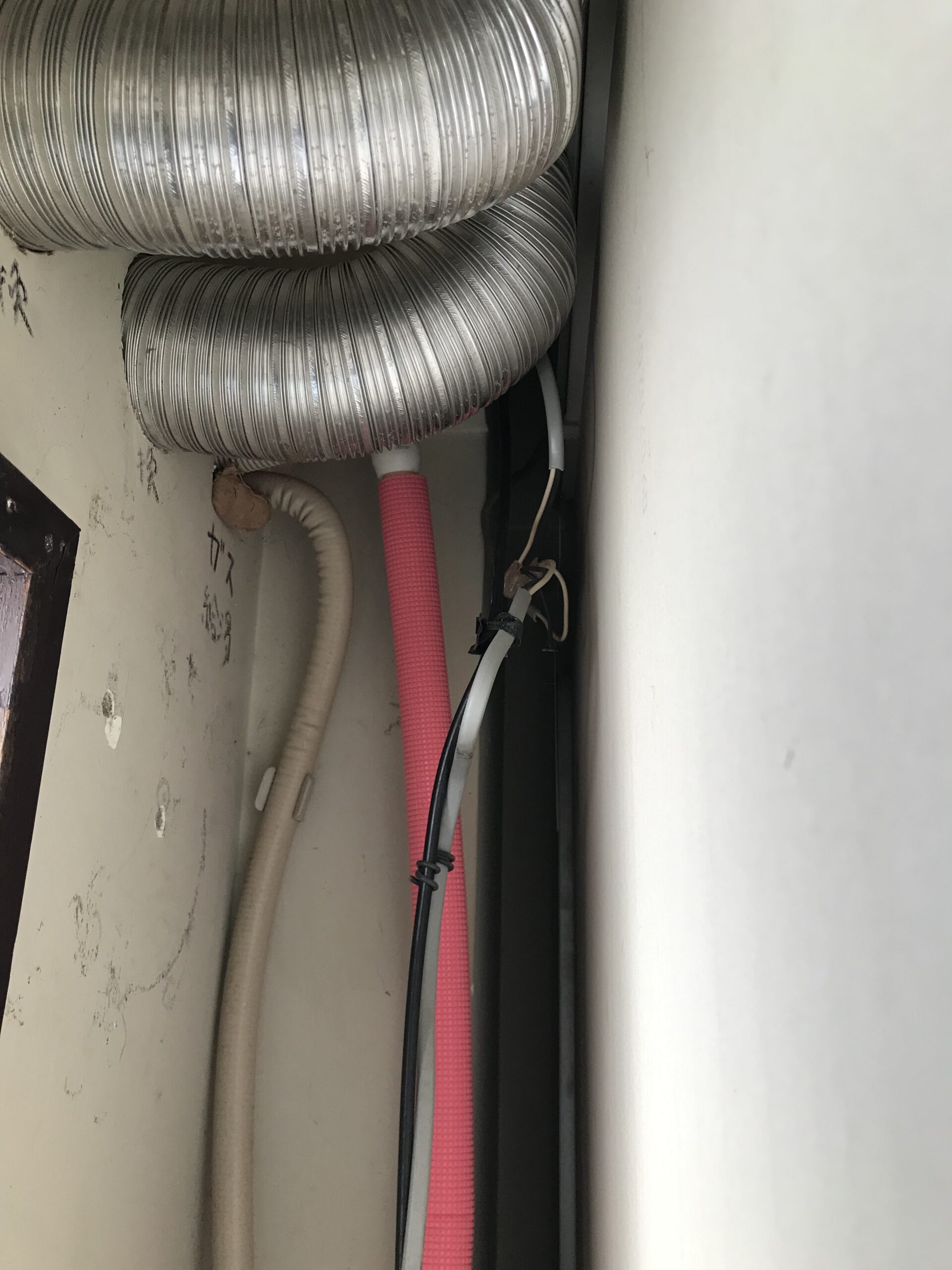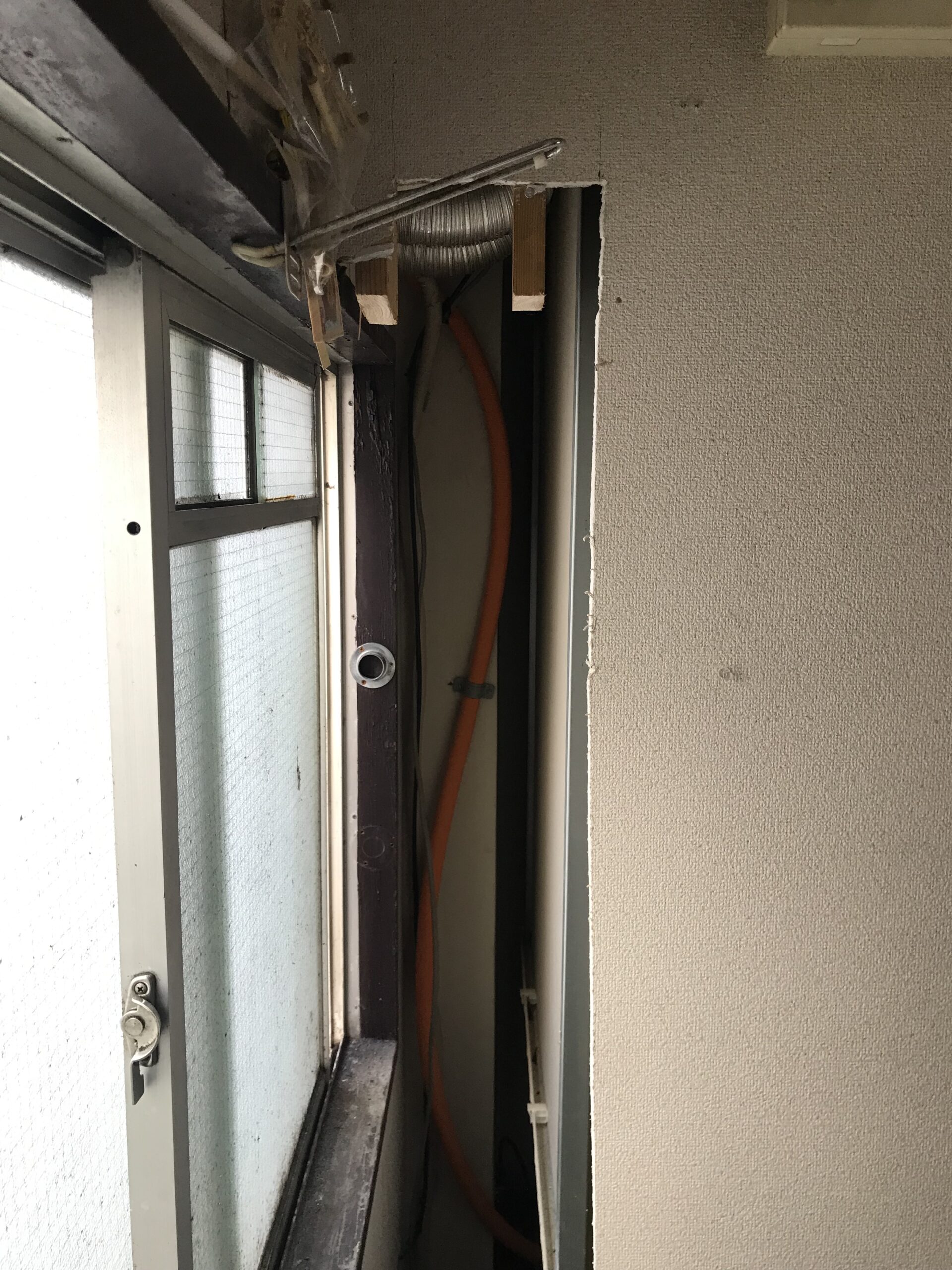 配管から漏水してしまい水が噴きだしてしまった為、急遽、壁を壊し配管を修理しました。